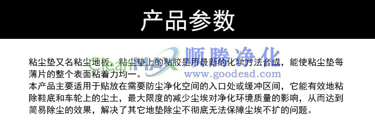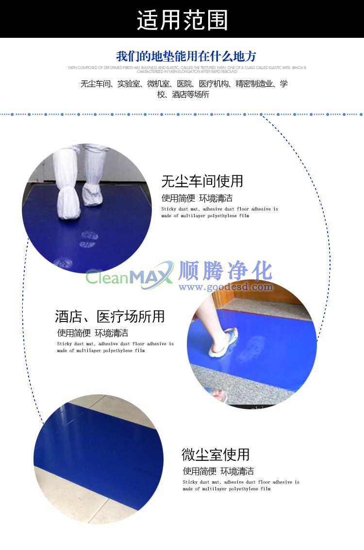 本產(chǎn)品主要適用于貼放在需要防塵凈化空間的入口處或緩沖區(qū)間,它能有效地粘除鞋底和車(chē)輪上的塵土,最大限度的減少塵埃對(duì)凈化環(huán)境質(zhì)量的影響,從而達(dá)到簡(jiǎn)易除塵的效果,解決了其它地墊除塵不徹底無(wú)法保障塵埃不擴(kuò)散的問(wèn)題。